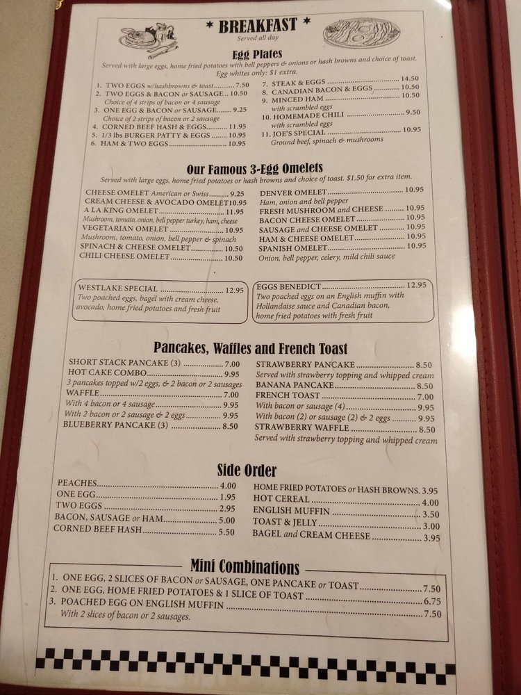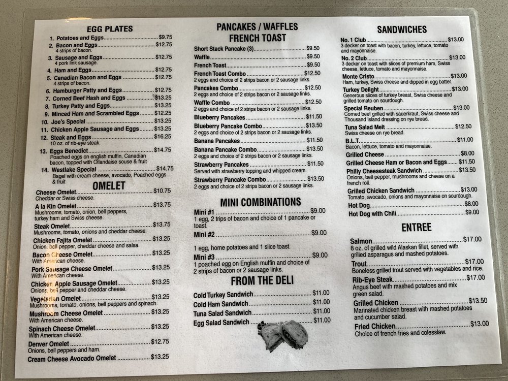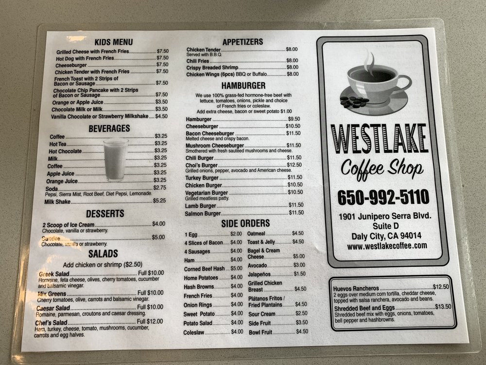 Welcome to Westlake Coffee Shop, a charming spot in Daly City, perfect for breakfast, brunch, and lunch. The menu offers an abundance of options that cater to various dietary preferences, from hearty egg plates to savory sandwiches. Highlights include the indulgent Steak and Eggs and the unique Joes Special, melding ground beef, spinach, and mushrooms in a delightful scramble.